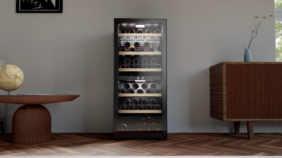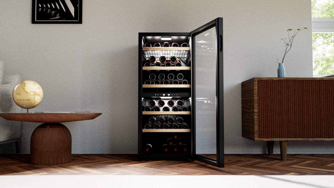 LS102DZBLACK wolnostojąca dwustrefowa winiarka do serwowania wina. Pojemność do 102 butelek wina.